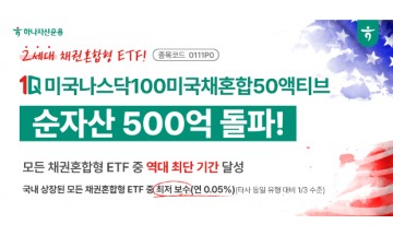 하나자산운용은 '1Q미국나스닥100미국채혼합50액티브 ETF'의 순자산이 11영업일 만에 500억원을 돌파했다고 24일 밝혔다.이는 국내에 상장된 모든 채권 혼합형 ETF 중 가장 빠른 기록이다.이 ETF는 퇴직연금(DC·IRP) 계좌에서 나스닥100 비중을 높이려는 투자 전략에 적합한 상품으로 평가된다. 퇴직연금 규정상 전체 자산의 30%는 예적금·채권형 등 안전 자산, 70%는 주식형 등 위험자산에 투자할 수 있는데, 안전 자산 구간에 1Q 미국나스닥100미국채혼합50액티브를, 위험 자산 구간에는 1Q 미국나스닥100 ETF를 편입하면 전체 포트폴리오의 최대 85%를 나스닥100에 노출시킬 수 있다. 이 상품의 총 보수는 연 0.05%로, 국내 상장된 모든 채권