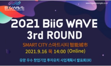 인천창조경제혁신센터가 오는 16일 ‘2021년도 제3회 빅웨이브 IR(투자유치 사업계획서 발표회)’를 온라인으로 개최한다고 밝혔다.     빅웨이브(BiiG WAVE)는 인천지역 유망기술 벤처창업기업의 육성과 인천 투자생태계 활성화를 위하여 인천창조경제혁신센터와 인천광역시가 공동으로 만든 투자유치 플랫폼 브랜드로, 지난 4월과 7월 성황리에 개최된 바 있다.     이번에 세 번째로 진행되는 빅웨이브(BiiG WAVE) 행사는 9월 16일 오후 2시 온라인으로 개최되며, 센터가 발굴한 유망기업 5개사가 투자유치 사업계획을 발표할 예정이다.      빅웨이브(BiiG WAVE) 투자유치 IR에 참여하는 기업은 스마트시티 분야의 우수한 기술력과 성장성을