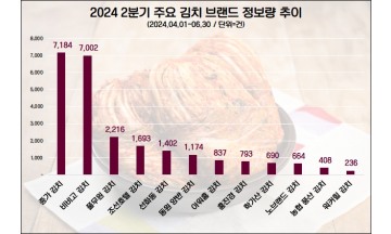 대상 ‘종가 김치’가 올 2분기 주요 김치 브랜드 가운데 온라인에서 가장 높은 소비자 관심도(정보량=포스팅 수)를 기록했다. 이어 ‘맛 평가’에서 잇단 칭찬이 이어진 CJ제일제당 ‘비비고 김치’가 종가 김치에 근소한 차이로 빅2를 형성했으며 라인업을 늘린 ‘풀무원 김치’가 3위를 차지했다.15일 여론조사기관인 데이터앤리서치는 뉴스·커뮤니티·블로그·카페·X(옛 트위터)·인스타그램·유튜브·페이스북·카카오스토리·지식인·기업/단체·정부/공공 등 12개 채널 23만 개 사이트를 대상으로 2024년 4월부터 6월까지 국내 김치 브랜드 12곳 관련 게시물 수(관심도=포스팅 수)를 빅데이터 분석했다고 밝혔다. 조사 대상은 국내