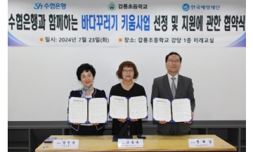 Sh수협은행은 지난 23일, 한국해양재단과 함께 ‘바다꾸러기 키움사업’ 대상 학교로 선정된 갑룡초등학교를 찾아 교내 해양 동아리 지원에 관한 삼자간 협약을 체결했다고 24일 밝혔다.인천광역시 강화군 소재 갑룡초등학교에서 진행된 이날 협약식에는 수협은행 강신숙 은행장과 한국해양재단 문해남 이사장, 갑룡초등학교 조윤옥 교장, 갑룡초 해양동아리 ‘그랑블루’ 소속 학생들이 참석했다.바다꾸러기 키움사업이란 한국해양재단이 추진하는 해양수산분야 청소년 교육지원 사업으로 지난달 전국 초‧중‧고교와 청소년 단체를 대상으로 ‘동아리 활동계획’ 공모를 진행했으며 심사를 통해 24개 동아리를 선정, 활동비 지원을 약속했다.앞