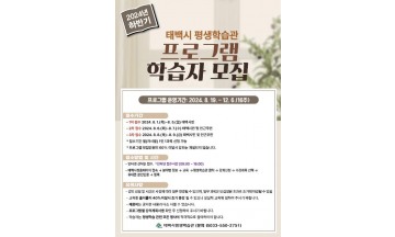 태백시는 오는 8월 1일부터 8월 9일까지 7일 간 하반기 평생학습관 정기 프로그램 학습자를 모집한다.신청은 온라인 접수(태백시청 홈페이지→평생학습관 교육 신청→ 강좌 신청→수강 과목 선택→휴대폰 본인인증 후 교육 신청)로 가능하다.접수 기간은 1차(태백시민) 8. 1.부터 8. 5.까지, 2차(태백시민 및 인근 주민) 8. 6.부터 8. 7.까지, 3차(태백시민 및 인근 주민) 8. 8.부터 8. 9.까지로, 차시별 1인 1과목 신청가능하다.운영 기간은 8월 19일부터 12월 6일까지 16주 동안이며, 개설 예정 과목은 자격증(8), 미술(2), 도자기(1), 서예(1), 어학(2), 스포츠·댄스(5), 생활공예(4), 생활요리(2), 생활음악(6), 인문·교양(2), 정보인터넷활