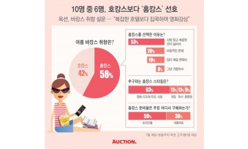 여름 바캉스 장소로 10명 중 6명은 호텔보다 집을 더 선호하는 것으로 나타났다. 온라인마켓플레이스 옥션이 지난 7월 18일부터 26일까지 9일 동안 고객 총 891명을 대상으로 ‘홈캉스 vs 호캉스’ 선호도에 대해 조사한 결과, 전체 응답자 중 58%가 집에서 즐기는 ‘홈캉스’를 선택했다고 30일 밝혔다.홈캉스를 택한 이유로 ‘사람 많고 복잡한 곳이 싫다’는 응답이 과반수를 넘는 53%를 차지해 가장 많았다. 그 외 ‘비용 절감을 위해’(20%), ‘집이 제일 편해서’(19%) 등의 응답이 근소한 차이로 그 뒤를 이었다. 응답자 중 8%는 ‘휴가를 준비하는 것이 귀찮다’는 이유를 들었다.구체적인 홈캉스 계획에 대한 질문에는 ‘밀린 영화나 미