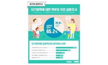 학부모 65% 이상이 자녀 단기방학에 긍정적인 것으로 조사됐다. 영어교육 전문기업 윤선생이 지난 5월 9일부터 14일까지 고등학생 이하 자녀를 둔 학부모 861명을 대상으로 설문 조사한 결과, 전체 응답자의 65.2%가 단기방학에 ‘긍정적’이라고 답했다. 소득형태에 따른 단기방학 선호도는 외벌이 부모(69.9%)가 맞벌이 부모(59.1%)보다 10%P가량 높았다. 단기방학에 긍정적인 이유로는 ‘가족들이 함께 보낼 수 있는 시간이 생겨서’(38.3%)가 1위로 꼽았다. 이어 ‘아이가 충분히 휴식을 취할 수 있어서’(25.9%), ‘자녀의 학업 스트레스 해소에 도움이 되어서’(14.1%) 순이었다. 이 외에도 ‘자녀의 체험학습 시간을 확보할 수 있어서’(1