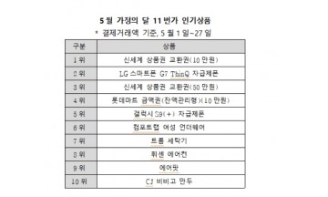 SK플래닛(사장 이인찬) 11번가가 31일 5월 한 달의 판매데이터를 분석했다고 밝혔다.결제거래액 기준 인기상품 1위는 ‘신세계 상품권 교환권(10만원)’이었다. 모바일로 발송된 MMS를 오프라인에서 지류상품권으로 교환해 사용할 수 있다. 그 외에도 ‘신세계 상품권 교환권(50만원)’(3위), ‘롯데마트 금액권(잔액관리형)’(4위) 등 모바일 기프티콘 상품들이 상위에 올랐다.또 11번가에서 단독 예약판매를 실시했던 ‘G7 씽큐(ThinQ) 자급제폰’(2위)을 포함해 ‘갤럭시 S9(+) 자급제폰’(5위), ‘에어팟’(9위) 등 화제의 스마트디지털 상품이 선물시즌 인기상품으로 떠올랐다.5월 한 달(5/1~27)중 고객들이 가장 많은 소비를 한 날은 ‘5월