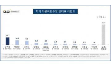 더불어민주당 차기 당대표 적합도 여론조사에서 김부겸 행정안전부 장관이 1위를 차지했다.지난 18일 한국사회여론연구소가 16일부터 17일간 실시한 전국 성인 남녀 1015명 대상 유·무선 전화면접 조사 결과, 응답자 중 16.7%가 차기 민주당 대표로 김 장관을 선택한 것으로 조사됐다.세부적으로 김부겸 장관이 16.7%로 1위, 박영선 의원이 10.3%로 2위, 이해찬 의원 9.3%로 3위였다. 이어 송영길 의원 4.0%, 김진표 의원 3.9%, 김두관 의원 2.8%, 최재성 의원 2.5%, 전해철 의원 2.2%, 이종걸 의원 1.5%, 이인영 의원 1.4% 순으로 나타났다. 모름/무응답 답변은 45.4% 였다. 이번 여론조사는 무작위 전화 걸기(RDD) 방식으로 유선전화 20.1%와