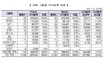 10대 그룹 시총 비중 51.5%… 전년대비 1.4% 감소
