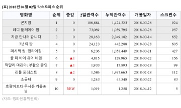 4월 2일 영화진흥위원회에 따른 영화순위(영화예매순위) 1위는 3월 28일 개봉한 '곤지암'으로 이날 관객수 106,884명이다.이어 2위는 3월 28일 개봉한 '레디 플레이어 원'으로 관객수 73,069명이며, 3위는 3월 14일 개봉한 '지금 만나러 갑니다'로 관객수 28,163명이다.또한 2일 순위에 새롭게 진입한 영화 '호랑이보다 무서운 겨울손님'은 관객수 1,019명으로 10위를 기록했다.[영화 순위] 1위 곤지암2위 레디 플레이어 원 3위 지금 만나러 갑니다4위 7년의 밤5위 퍼시픽 림: 업라이징6위 콜 미 바이 유어 네임7위 막달라 마리아: 부활의 증인8위 리틀 포레스트9위 소공녀10위 호랑이보다 무서운 겨울손님