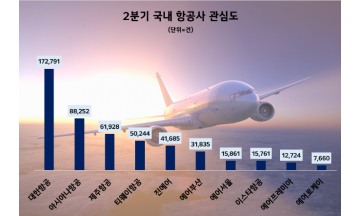 대한항공이 지난 2분기 국내 10개 항공사 중 여행객과 소비자들로부터 가장 높은 관심도를 기록한 것으로 나타났다.제주항공은 저비용 항공사(LCC) 중 관심도 1위를 기록했다.10일 데이터앤리서치는 커뮤니티·블로그·카페·X(옛 트위터)·인스타그램·유튜브·페이스북·카카오스토리·지식인·기업/단체·정부/공공 등 11개 채널 22만 개 사이트를 대상으로 지난 4월부터 6월까지 국내 항공사 10곳에 대해 빅데이터 분석을 진행했다고 밝혔다.조사 대상은 정보량 순으로 ▲대한항공[003490] ▲아시아나항공[020560] ▲제주항공[089590] ▲티웨이항공[091810] ▲진에어[272450] ▲에어부산[298690] ▲에어서울 ▲이스타항공 ▲에어프레미아 ▲에