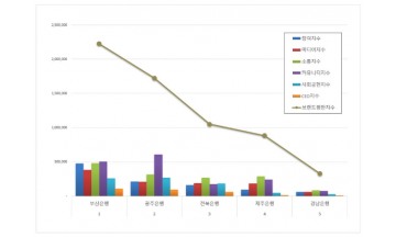 지난 한달간 지방은행 브랜드평판을 빅데이터로 분석한 결과, 1위 부산은행 2위 광주은행 3위 전북은행 순으로 조사됐다. 한국기업평판연구소(소장 구창환)는 5개 지방은행 브랜드에 대해서 지난 8월 9일부터 9월 9일까지의 지방은행 브랜드 빅데이터 621만6,194개를 분석하여 소비자들의 지방은행 브랜드 평판을 알아낸 결과 지난 8월 지방은행 브랜드 빅데이터 839만837개와 비교하면 25.92% 줄어들었다고 9일 밝혔다. 브랜드에 대한 평판지수는 브랜드에 대한 소비자들의 활동 빅데이터를 참여가치, 소통가치, 소셜가치, 시장가치, 사회공헌가치로 나누게 되며 지방은행 브랜드 평판조사에서는 참여지수와 미디어지수, 소통지수, 커뮤
