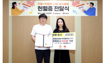 빗썸(대표 이재원)이 한국조혈모세포은행협회에 헌혈증 100장을 기부했다.빗썸은 2022년부터 매 분기마다 헌혈 행사 및 헌혈증 기부 활동을 꾸준히 진행하고 있다. 올해에도 2월, 5월, 8월에 헌혈 행사를 진행했다.지난 12일엔 빗썸이 8월 헌혈 행사를 통해 모은 헌혈증 100장을 한국조혈모세포은행협회에 전달하는 기부식을 진행했다고 13일 밝혔다. 서울 강남구 소재 빗썸 본사에서 진행된 기부식에는 박리나 한국조혈모세포은행협회 기증증진팀장, 허지용 빗썸 총무팀장 등 양사 임직원들이 참석했다.이번 기부를 포함해, 빗썸은 현재까지 400장의 헌혈증서를 기부했다. 기부된 헌혈증은 백혈병 등 혈액암으로 투병 중인 환자들을 위해 사용될