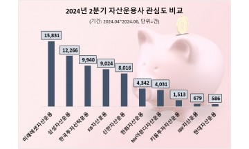 지난 2분기 국내 주요 자산운용사 가운데 온라인 관심도(정보량=포스팅 수)가 가장 높은 곳은 '미래에셋자산운용'으로 나타났다. 삼성자산운용과 한국투자신탁운용이 뒤를 이었다.10일 데이터앤리서치는 본지 의뢰로 2024년 4월부터 6월까지 뉴스·커뮤니티·블로그·카페·유튜브·트위터·인스타그램·페이스북·카카오스토리·지식인·기업/조직·정부/공공 등 12개 채널 23만 개 사이트를 대상으로 국내 자산운용사에 대한 포스팅 수를 조사했다고 밝혔다.조사 대상은 임의 선정했으며 2분기 정보량 순으로 ▲미래에셋자산운용 ▲삼성자산운용 ▲한국투자신탁운용 ▲KB자산운용 ▲신한자산운용 ▲한화자산운용 ▲NH아문디자산운용 ▲키움투자