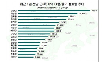 전남 담양군이 최근 1년간 전라남도 군(郡) 지역 가운데, 국민들의 ‘여행’ 및 ‘휴가’ 관련 관심도(정보량=포스팅 수)가 가장 높았던 것으로 나타났다. 이어 해남군, 진도군 순으로 조사됐다.담양군은 유럽못지 않은 뷰가, 해남군은 해상 케이블카가 장점으로 떠올랐다.9일 여론조사기관 데이터앤리서치는 뉴스·커뮤니티·블로그·카페·X(옛 트위터)·인스타그램·유튜브·페이스북·카카오스토리·지식인·기업/단체·정부/공공 등 12개 채널 23만 개 사이트를 대상으로 2023년 6월부터 2024년 5월까지 전남지역 군 ‘여행’ 관련 게시물 수(관심도=포스팅 수)를 빅데이터 분석했다고 밝혔다.     조사 대상은 전남지역 행정구역 중 ‘군’