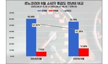 최근 신차 홍보 영상에서 영상과 관련 없는 손동작 문제로 논란이 된 르노코리아의 6월 소비자 호감도가 전년 대비 약 10%나 크게 떨어진 것으로 나타났다.9일 여론조사기관 데이터앤리서치는 본지 의뢰로 뉴스·커뮤니티·블로그·X(옛 트위터)·인스타그램·유튜브·페이스북·카카오스토리·지식인·기업/단체·정부/공공 등 11개 채널 22만 개 사이트를 대상으로 2024년 6월 기준 르노코리아에 대한 소비자 호감도를 빅데이터 분석했다고 밝혔다.     조사 방법은 2024년 6월 한 달간 ‘르노코리아’를 키워드로 지정해 분석했다. 광고 포스팅이 많은 ‘카페’ 채널은 이번 조사에서 제외했다.     분석 결과, 르노코리아는 긍정률 55.96%, 부