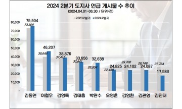 김동연 경기도지사가 올 2분기 국내 9개도(강원·전북·제주특별자치도 포함) 도지사 가운데, 온라인에서 가장 높은 관심도(정보량=포스팅 수)를 나타냈다. 이어 이철우 경북 지사, 김영록 전남 지사 순으로 조사됐다.4일 여론조사기관 데이터앤리서치는 본지 의뢰로 뉴스·커뮤니티·블로그·카페·X(옛 트위터)·인스타그램·유튜브·페이스북·카카오스토리·지식인·기업/단체·정부/공공 등 12개 채널 23만 개 사이트를 대상으로 2024년 4월부터 6월까지 국내 9도 도지사에 대한 관심도(언급량=게시물 수)를 빅데이터 분석했다고 밝혔다.     조사 방법은 '이름 + 지사' 키워드로 하되 두 키워드간 한글 기준 15자 이내인 경우만 결과값으로