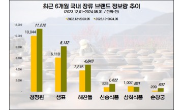 소비자들이 고물가로 외식을 줄이면서 장류 업계가 수혜를 보고 있는 가운데 대상 청정원이 최근 6개월 동안 장류를 다루고 있는 국내 주요 식품 브랜드 6곳 중 가장 높은 온라인 관심도(정보량=포스팅 수)를 보인 것으로 나타났다.이어 샘표와 해찬들이 뒤를 이었다.18일 여론조사기관 데이터앤리서치는 뉴스·커뮤니티·블로그·카페·X(옛 트위터)·인스타그램·유튜브·페이스북·카카오스토리·지식인·기업/단체·정부/공공 등 12개 채널 23만 개 사이트를 대상으로 2023년 12월부터 2024년 5월까지 국내 6개 장류 브랜드의 전체 게시물 수(정보량=포스팅 수)를 빅데이터 분석했다고 밝혔다.     조사 브랜드는 국내 시판 중인 장류 브랜드