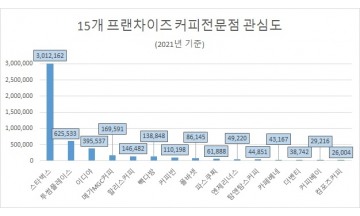 지난 2021년 15개 프랜차이즈 커피전문점의 관심도(정보량=포스팅 수)를 조사한 결과 스타벅스가 압도적인 1위를 기록한 것으로 나타났다. 본지는 7일 지난 2021년 한해 동안 뉴스·커뮤니티·카페·유튜브·블로그·트위터·인스타그램·페이스북·카카오스토리·지식인·기업/조직·정부/공공 등 12개 채널 22만개 사이트를 대상으로 15개 프랜차이즈 커피전문점에 대해 빅데이터 분석했다.분석 대상 15개 프랜차이즈 커피전문점은 2021년 1년 간 정보량 순으로 ▲스타벅스(㈜스타벅스커피코리아 대표 송호섭) ▲투썸플레이스(대표 이영상) ▲이디야(대표 문창기) ▲메가MGC커피(대표 김대영) ▲할리스커피(대표 이종현) ▲빽다방(대표 백종원)