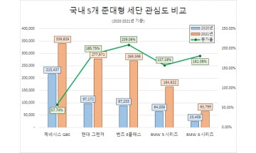국내 시판 준대형 6개 승용차를 대상으로 최근 2년간 온라인 총정보량(소비자 관심도)을 비교 분석한 결과 지난 한해 소비자들은 현대자동차그룹 제네시스 'G80'에 대해 가장 높은 관심도를 보였던 것으로 나타났다.전년비 지난해 관심도 증가율은 벤츠' E클래스'가 가장 높았다.특기할만한 것은 지난해 조사대상 차종의 관심도가 2020년도에 비해 모두 크게 늘어나 소비심리가 되살아난 것으로 평가되고 있다.7일 빅데이터뉴스는 2020년과 2021년 뉴스·커뮤니티·카페·유튜브·블로그·트위터·인스타그램·페이스북·카카오스토리·지식인·기업/조직·정부/공공 등 12개 채널 22만개 사이트를 대상으로 첫 모델 출시일이 2년 이상 경과된 준