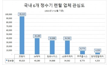 '코웨이' 2021년 정수기 렌털업계 관심도 '톱'…'LG퓨리케어' 호감도 1위