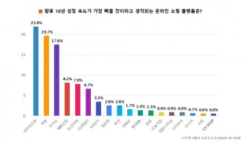 향후 10년 성장 속도가 가장 빠를 것으로 생각되는 온라인 쇼핑 플랫폼으로 네이버 쇼핑(22.0%)이 가장 높게 나타났다. 이어 쿠팡(19.7%), 카카오(17.6%), SSG닷컴(8.2%), 당근마켓(7.9%), 마켓컬리(6.7%), 11번가(3.5%), G마켓 (2.6%), 옥션(2.6%), 위메프(1.7%), 롯데On(1.4%), 오늘의집(0.9%), CJ온스타일(0.9%), 인터파크(0.9%), 다나와(0.7%), 티몬(0.6%), GS SHOP(0.6%) 순이었다. 엘림넷 나우앤서베이는 나우앤서베이 패널 회원을 대상으로 설문조사 결과를 9일 발표했다. 설문 기간은 2021년 6월 23일부터 10월 30일까지며, 설문 응답자는 10대~60대 나우앤서베이 전국 패널 회원 총 984명(남성 500명, 여성 484명)이다.해당 쇼핑몰이 향