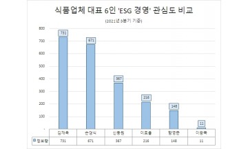국내 식품업체 수장 6명을 대상으로 올 3분기인 7~9월 'ESG 경영'에 대한 정보량(포스팅 수=관심도)을 집계한 결과 김재옥 동원F&B 대표의 관심도가 가장 높은 것으로 나타났다. 본지는 4일 뉴스·커뮤니티·블로그·카페·유튜브·트위터·인스타그램·페이스북·카오스토리·지식인·기업/조직·정부/공공 등 12개 채널 22만개 사이트를 대상으로 올 7월1일~10월31일 국내 식품업체 수장 6인의 'ESG 경영' 포스팅 수를 분석했다.분석 대상 식품업체 수장은 3분기 '정보량 순'으로 ▲김재옥 동원F&B 대표 ▲손경식 CJ제일제당 대표 ▲신동원 농심 대표 ▲이효율 풀무원 대표 ▲함영준 오뚜기 대표 ▲이광복 동서식품 대표 등 6명이다.남양유업의