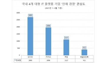 취업시장에서 대형 IT플랫폼 기업들을 일컫는 신조어인 이른바 '네카라쿠배'(네이버, 카카오, 라인, 쿠팡, 배달의민족)에서 '라인'을 제외한 4개사 중 '인재 경영'에 가장 관심이 많은 곳은 '네이버'로 나타났다.  8일 본지는 올 1월1일부터 3월31일까지 3개월간 뉴스·커뮤니티·블로그·카페·유튜브·트위터·인스타그램·페이스북·카카오스토리·지식인·기업/조직·정부/공공 등 12개 채널 22만개 사이트를 대상으로 4개 국내 대형 IT플랫폼 업체들의 '인재 경영' 정보량을 조사했다.분석 대상 기업은 올 1분기 인재경영 정보량 순으로 ▲네이버(대표 한성숙) ▲카카오(대표 여민수, 조수용) ▲쿠팡(대표 강한승, 박대준) ▲배달의민족(우아