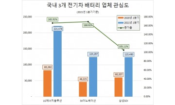 올 1분기 국내 3개 전기차 배터리 업체 중 정보량이 가장 많은 업체는 'LG에너지솔루션(LG화학)'이지만 지난해 1분기 대비 관심도 상승률은 'SK이노베이션'이 가장 높았다.SK이노베이션은 호감도도 가장 높았다.10일 글로벌빅데이터연구소(소장 김다솜)는 올 1~3월 뉴스·커뮤니티·블로그·카페·유튜브·트위터·인스타그램·페이스북·카카오스토리·지식인·기업/조직·정부/공공 등 12개 채널을 대상으로 국내 3개 전기차 배터리 업체의 빅데이터 분석을 실시했다고 밝혔다. 분석 대상 업체는 '정보량 순'으로 ▲LG에너지솔루션(대표 김종현) ▲SK이노베이션(대표 김준) ▲삼성SDI(대표 전영현) 등이다.단, 'LG에너지솔루션'의 경우 물적분할