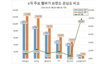 올 1~3월 주요 햄버거 브랜드 6곳 중 소비자들의 포스팅(관심도)이 가장 많은 곳은 '맥도날드'로 나타났다. 소비자 호감도는 '노브랜드버거'가 가장 높았다. 3일 글로벌빅데이터연구소(소장 김다솜)는 올 1~3월 뉴스·커뮤니티·블로그·카페·유튜브·트위터·인스타그램·페이스북·카카오스토리·지식인·기업/조직·정부/공공 등 12개 채널 22만개 사이트를 대상으로 국내 6개 햄버거 브랜드에 대한 빅데이터 분석을 실시했다고 밝혔다.연구소 선정 조사 대상은 브랜드는 올 1분기 정보량 순으로 ▲맥도날드(한국맥도날드(유), 대표 앤토니 노리스 마티네즈) ▲롯데리아(롯데지알에스㈜, 대표 차우철) ▲버거킹(㈜BKR, 대표 문영주) ▲KFC(케