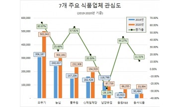 지난해 국내 주요 7개 식품업체 중 소비자들의 포스팅이 가장 많은 곳은 '오뚜기'로 조사됐다.오뚜기는 2019년 대비 지난해 관심도 상승률도 가장 높아 눈길을 끌었다. 23일 빅데이터뉴스는 지난해 1월부터 12월까지 1년간 뉴스·커뮤니티·블로그·카페·유튜브·트위터·인스타그램·페이스북·카카오스토리·지식인·기업/조직·정부/공공 등 12개 채널 22만개 사이트를 대상으로 7개 주요 식품업체에 대한 빅데이터 분석을 실시했다고 밝혔다.관심도의 경우 2019년과 비교 분석도 병행했으며 분석 대상 업체는 지난해 정보량 순으로 ▲오뚜기(대표 함영준, 이강훈) ▲농심(대표 신동원 박준) ▲풀무원(대표 이효율) ▲CJ제일제당(대표 손경식