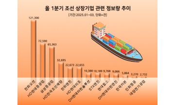지난 1분기 국내 조선업종 상장기업 가운데 투자자들의 관심도(정보량=포스팅 수)가 가장 높은 곳은 '한화오션'으로 조사됐다. 이어 HD현대중공업, 삼성중공업 순으로 나타났다.25일 데이터앤리서치는 본지 의뢰로 2025년 1월부터 3월까지 뉴스·커뮤니티·블로그·카페·유튜브·트위터·인스타그램·페이스북·카카오스토리·지식인·기업/조직·정부/공공 등 12개 채널 24만개 사이트에서 13개 조선 상장기업의 포스팅 수를 조사했다고 밝혔다.조사 대상은 정보량 순으로 △한화오션 △HD현대중공업 △삼성중공업 △HD한국조선해양 △한화엔진 △HD현대미포 △HD현대마린솔루션 △STX엔진 △현대힘스 △HD현대마린엔진 △한국카본 △인화정공
