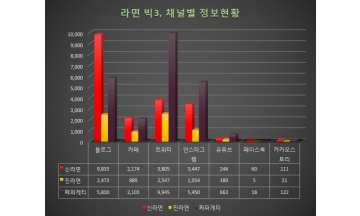 한국에서 가장 많이 팔리는 빅3 라면은 농심의 신라면과 오뚜기의 진라면, 농심 짜파게티 순이다.이들 3개 라면을 대상으로 9월 한달간 개인정보 7개 채널을 대상으로 '라면' 정보량으로 조사한 결과 짜파게티가 2만4131건(47.3%)으로 가장 많은 정보량을 기록한 것으로 나타났다.신라면이 1만9676건(38.6%)으로 2위, 진라면이 7169건(14.1%)로 3위였다. 매출순위는 진라면이 2위지만 정보순위는 3위인 짜파게티의 3분의 1도 되지 않아 개인채널에서의 적극적인 마케팅을 펼치지 않을 경우 향후 매출 하락이 점쳐지는 부분이다.조사대상 채널은 블로그 카페 트위터 인스타그램 페이스북 유튜브 카카오스토리 등 7개 채널이다. 개인대상 선호도와