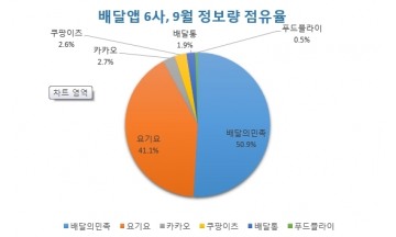 최근 급성장하고 있는 배달시장을 배달의민족과 요기요가 양분하고 있는 가운데 카카오등 나머지 중소업체들이 치열한 경쟁을 벌이고 있는 것으로 드러났다.21일 본지가 뉴스등 12개 채널을 대상으로 배달의민족(배민 키워드 포함)을 비롯 요기요, 카카오, 쿠팡이츠, 배달통, 푸드플라이등 배달앱 6개사의 9월 정보량을 조사한 결과 이같이 나타났다. 조사대상 채널은 뉴스와 블로그를 비롯, 카페 커뮤니티 트위터 인스타그램 페이스북 유튜브 카카오스토리 지식인 기업/단체 정부/공공 등 12개이다. 조사에서 배달의 민족은 9월 한달간 4만500건의 정보량을 기록 전체 50.9%를 차지했으며 요기요가 3만2733건으로 41.1%를 점유했다. 기타 업체로