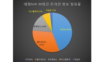 SUV 차량이 갈수록 인기를 얻고 있는 가운데 최근 들어선 대형SUV시장이 급부상하고 있다.최근 핫한 시장에서 가장 핫한 모델은 어느 차종일까.'빅데이터뉴스'가 현대자동차(대표 이원희) 팰리세이드, 기아자동차(대표 박한우) 모하비, 한국GM(대표 카허카젬) 트래버스, 포드세일즈서비스코리아(대표 정재희)의 익스플로러, 혼다코리아(대표 이지홍) 파일럿 등 5개 차종을 대상으로 조사한 결과 지난 9월 한달동안 12개 채널 온라인에서 가장 많이 관심을 받은 '대형SUV' 차종은 기아자동차의 '모하비'와 현대자동차의 '팰리세이드'인 것으로 조사됐다(위 차트 참조).최근 페이스 리프트된 모하비를 제외한 4개 신형(풀체인지 포함) 차종에선 '팰
