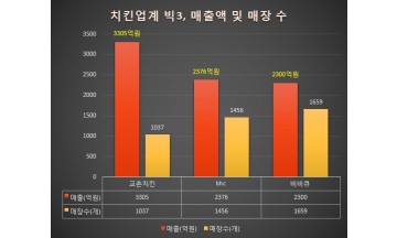 치킨 소비자들은 빅3 치킨중 비비큐에 대해 가장 많은 관심을 가지고 있는 것으로 조사됐다.bhc가 2위의 관심도를 기록했고 교촌의 정보량이 가장 적었다.공정거래위원회 자료에 따르면 지난해말 매출 기준 치킨업계 빅3의 매장수는 제너시스비비큐 1659개, bhc 1456개, 교촌에프앤비 1037개로 각각의 점유율은 비비큐 39.9%, bhc 35.0%, 교촌 24.9% 순으로 나타났다.이들 빅3의 매출액은 교촌에프앤비 3305억원, bhc 2376억원, 비비큐 2300억원이었다. 아래 표에서 보듯 매장수 대비 매출액 효율은 교촌이 가장 좋았다. 물론 임대료 등 비용을 계상하지 않은 것이어서 매출액 효율이 수익 효율로 꼭 연결된다고 볼수는 없다. 예컨대 유동인구가