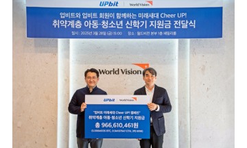 디지털자산거래소 업비트를 운영하는 두나무가 취약가정 아동·청소년들을 위한 '미래 세대 Cheer UP!' 캠페인을 마치고 기부금을 전달했다고 31일 밝혔다. 기부금 전달식은 지난 28일 서울 영등포구 여의도동에 위치한 월드비전 본부에서 진행됐다. 박영준 두나무 상무와 김성태 월드비전 ESG 사회공헌본부장 등 관계자들이 배석한 가운데, 취약가정 아동·청소년들의 새로운 시작을 응원하기 위한 후원기금 약 9억7000만원(9억 6661만원)이 전달됐다. 업비트의 '미래 세대 Cheer UP!' 캠페인은 취약가정 아동·청소년들을 위한 디지털 자산 기부 캠페인이다.지난 7일부터 21일까지 약 2주간 모인 회원 기부금은 5.00846135 비트코인(BTC), 0.94