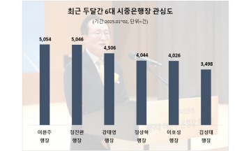 6대 시중은행장 가운데 이환주 KB국민은행장이 최근 두달간 온라인에서 가장 높은 관심도(정보량=포스팅 수)를 기록했다. 정진완 우리은행장과 강태영 NH농협은행장 순이었다.1일 여론조사기관인 데이터앤리서치는 빅데이터뉴스 의뢰로 뉴스·커뮤니티·블로그·카페·유튜브·트위터·인스타그램·페이스북·카카오스토리·지식인·기업/조직·정부/공공 등 12개 채널 24만 개 사이트를 대상으로 올 1월부터 2월까지 주요 은행 6곳의 은행장에 대한 온라인 관심도(정보량 = 포스팅 수)를 분석했다고 밝혔다.조사 대상은 정보량 순으로 △이환주 KB국민은행장 △정진완 우리은행장 △강태영 NH농협은행장 △정상혁 신한은행장 △이호성 하나은행장