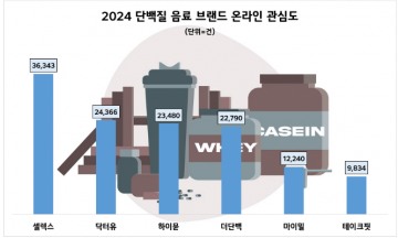 매일유업의 단백질 보조제 셀렉스가 지난해 1년간 국내 시판되고 있는 주요 프로틴 음료 브랜드 중 가장 높은 소비자 관심도를 기록했다.오리온 닥터유가 뒤를 이었다.7일 여론조사기관인 데이터앤리서치는 2024년 1월부터 12월까지 뉴스·커뮤니티·카페·유튜브·블로그·트위터·인스타그램·페이스북·카카오스토리·지식인·기업/조직·정부/공공 등 12개 채널 23만개 사이트를 대상으로 국내 주요 단백질 음료 브랜드의 관심도(포스팅수 = 정보량)를 조사했다고 밝혔다.조사 대상은 임의 선정했으며 정보량 순으로 △매일유업(267980) 셀렉스 △오리온(271560) 닥터유 △일동후디스 하이뮨 △빙그레(005180) 더단백 △대상웰라이프 마이밀