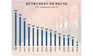 최근 두달간 전라남도 군수 가운데 민생에 가장 많은 관심을 보인 이는 '김산 무안군수'로 나타났다. 이어 우승희 영암군수, 이상익 함평군수가 뒤를 이었다.10일 데이터앤리서치는 2024년 9월부터 10월까지 뉴스·커뮤니티·블로그·카페·유튜브·트위터·인스타그램·페이스북·카카오스토리·지식인·기업/조직·정부/공공 등 12개 채널, 23만개 사이트에서 전남지방 군수의 민생 관련 포스팅 수를 조사했다고 밝혔다.참고로 전남지방 군수는 총 17명이나 지난 5월 당선무효형을 받아 직위 해제된 2명(강종만 영광군수, 이상철 곡성군수)은 조사 대상에서 제외 후 조사했다.분석 대상은 정보량 순으로 ▲김산 무안군수 ▲우승희 영암군수 ▲이