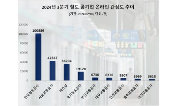 3분기 한국철도공사(코레일)가 국내 철도 공기업 중 온라인에서 가장 높은 관심도(정보량=포스팅 수)를 기록한 것으로 나타났다. 이어 서울교통공사와 에스알(SR) 순이었다.9일 데이터앤리서치는 본지 의뢰로 뉴스·커뮤니티·블로그·카페·유튜브·X(옛 트위터)·인스타그램·페이스북·카카오스토리·지식인·기업/조직·정부/공공 등 12개 채널 23만 개 사이트를 대상으로 2024년 7월부터 9월까지 국내 철도 공기업 9곳의 관련 게시물 수(관심도=포스팅 수)를 빅데이터 분석했다고 밝혔다.조사 대상은 국토교통부 산하 철도 공기업 및 전국 철도 공기업으로 선정했다. 3분기 정보량 순으로 △코레일 △서울교통공사 △SR △국가철도공단 △부