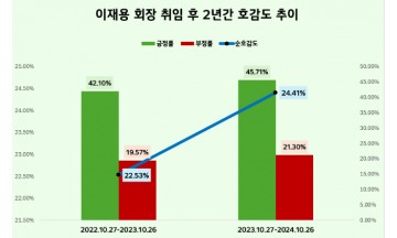 최근 부진한 실적과 주가 하락으로 삼성전자(005930)가 '위기론'에 휩싸인 가운데 27일 취임 2주년을 맞은 이재용 회장에 대한 국민의 기대와 성원이 더욱 높아지고 있는 것으로 나타났다.28일 데이터앤리서치는 이재용 회장 취임 후 2년간 빅데이터 분석을 실시한 결과 최근 1년간 온라인 관심도와 호감도 모두 취임후 첫 1년간 대비 상승했다고 밝혔다.데이터앤리서치는 뉴스·커뮤니티·카페·유튜브·블로그·X(옛 트위터)·인스타그램·페이스북·카카오스토리·지식인·기업/조직·정부/공공 등 12개 채널 23만개 사이트를 대상으로 이재용 회장에 대해 지난 2022년 10월 27일 취임일부터 취임 2주년 전날인 2024년 10월26일까지 최근 2년동