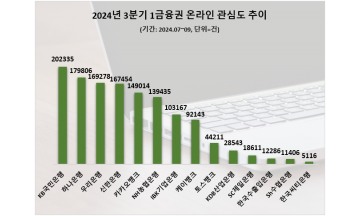 올 3분기 1금융권 은행 가운데 온라인상에서 금융 소비자 및 고객 등의 관심도(정보량=포스팅 수)가 가장 높은 곳은 'KB국민은행'으로 나타났다. 이어 하나은행과 우리은행, 신한은행이 뒤를 이었다.빅데이터 호감도는 IBK기업은행이 가장 좋았다.23일 데이터앤리서치는 빅데이터뉴스 의뢰로 뉴스·커뮤니티·카페·유튜브·블로그·트위터·인스타그램·페이스북·카카오스토리·지식인·기업/조직·정부/공공 등 12개 채널 23만개 사이트를 대상으로 2024년 7월부터 9월까지 국내 1금융권의 온라인 관심도를 조사했다고 밝혔다.조사 대상은 정보량 순으로 △KB국민은행 △하나은행 △우리은행 △신한은행 △카카오뱅크 △NH농협은행 △IBK기업은