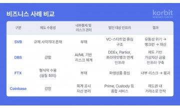 코빗(대표 오세진) 산하 코빗 리서치센터가 법인 대상 가상자산 금융 인프라 구축 전략을 다룬 보고서를 발간했다고 15일 밝혔다.해당 보고서는 미국의 실리콘밸리은행(SVB), 싱가포르의 DBS은행, 그리고 글로벌 가상자산 거래소인 FTX와 코인베이스(Coinbase)의 비즈니스 사례를 중심으로, 국내 거래소와 금융기관이 법인 투자 고객을 유치하기 위해 갖춰야 할 전략 등을 분석했다.보고서에 따르면, SVB와 FTX는 기술 중심 전략과 빠른 성장으로 시장을 장악했으나 내부통제 미비, 자산 분리 실패, 규제 회피 등 구조적 결함으로 인해 결국 붕괴했다. 반면, DBS와 코인베이스는 회계 투명성, 자산 수탁 체계, 규제 준수 등 제도권 기준을 충실히