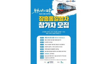 장흥군은 다음달 20일 출발하는 ‘정남진 장흥 통일열차’ 탑승객을 모집한다고 5일 밝혔다.‘정남진 장흥 통일열차’는 10월 20일 오전 장흥군민회관을 출발해 휴전선 인근 도라산역까지 운행한다. 열차 운행 노선은 광주광역시 효천역에서 파주시 도라산역까지 412.3km 구간이다. 탑승객 모집은 이달 중 온라인 모집으로 진행되며, 장흥군청 누리집 또는 통일열차 홈페이지를 통해 가능하다.통일열차에 몸을 실을 수 있는 승객은 장흥군민 또는 장흥 출향 향우에 한정되며 인원은 총 380명이다. 참가비는 인당 13만 원이다.이번 행사는 열차 운행 중 강연·공연 및 DMZ, 제3땅굴 투어 까지 포함되어 있어 한반도 분단 현실을 실감할 수 있는 평