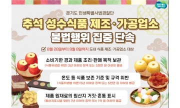 경기도 특별사법경찰단이 오는 28일부터 9월 8일까지 추석 명절 선물‧제수용 식품의 안전을 선제적으로 강화하기 위해 제조·가공업소 360개소를 집중 단속한다고 22일 밝혔다.  주요 단속내용은 ▲소비기한 경과 제품 조리·판매 목적 보관·사용 행위 ▲식품 보존 기준·규격 위반 판매 또는 판매할 목적으로 제조·가공·사용 행위 ▲완제품의 원재료 원산지 거짓 여부 등이다 식품위생법에 따르면 소비기한이 경과된 제품·식품 또는 그 원재료를 제조·가공·조리·판매 목적으로 소분·운반·진열·보관 또는 판매 등의 위반행위 시 3년 이하의 징역 또는 3,000만 원 이하의 벌금이 부과되고, 식품 보존 기준·규격을 위반했을 경우 5년 이