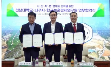 나주시와 전남대학교, 한국농촌경제연구소가 상호 인적·물적 교류에 중점을 둔 파트너십을 통해 상생 발전을 도모키로 했다. 전라남도 나주시(시장 윤병태)는 전날 전남대 본관 제1세미나실에서 전남대, 한국농촌경제연구소와 특성화 전략 수립 및 국책사업 추진을 위한 업무협약을 체결했다고 17일 밝혔다.3곳 기관은 협약에 따라 지·산·학·연(지자체·기업·대학·연구소)이 연계된 특성화 전략 수립 및 글로컬대학30을 포함해 다양한 국책사업을 공동 기획·추진한다. 특히 농업이라는 공통분모 아래 농업 관련 학과 졸업자와 청년농업인의 안정적인 영농 정착을 도울 계획이다. 이를 위해 나주 봉황면에 위치한 전남대 봉황농장에서 미래
