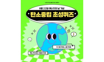 순천시(시장 노관규)가 에너지의 날을 기념해 전 시민 탄소중립 생활 실천 활성화를 유도하는 ‘탄소중립 초성퀴즈 SNS 이벤트’를 진행한다. 2월부터 진행되어 온 기후변화대응 이벤트는 사회관계망서비스(SNS)를 통한 홍보로 ‘기후위기는 현실! 탄소중립은 필연!’이라는 인식 제고와 대한민국 생태수도 일류순천에 걸맞은 시민주도의 2050 탄소중립 목표를 실현하고자 마련됐다. 8월 22일 제20회 에너지의 날을 기념하여 21시부터 5분간 진행되는 전국적인 소등행사의 의미를 되새기고, 시민들의 참여를 유도하기 위해 ‘초성퀴즈 맞히기 이벤트’를 준비했다.14일부터 순천시 공식 인스타그램을 통해 참여할 수 있으며, 해시태그 #순천시에너