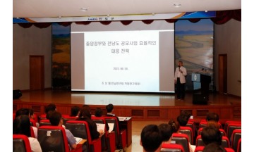 진도군이 군 산하 전 직원을 대상으로 공모사업의 효율적 대응을 위한 직원 역량강화 교육을 실시했다.진도군청 대회의실에서 8일(화) 조상필 전남연구원 객원연구위원을 초청해 ‘공모사업 효율적 대응전략’이라는 주제로 교육을 실시했다.이번 교육은 ▲공모사업 유치 필요성과 중요성 ▲공모사업의 개괄‧공모절차상 고려사항 ▲진도군의 대응 전략 등으로 전남도와 중앙부처의 공모사업에 선제적으로 대응할 수 있는 방안을 강조했다.교육을 통해 공모사업의 준비단계부터 응모‧선정‧사후관리 등의 방향 제시와 타 지자체 우수사례 등을 활용한 알기 쉬운 설명을 통해 체계적이고 적극적인 공모사업 대응 역량을 갖출 수 있는 방안을 제시