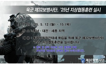 육군 제32보병사단은 오는 5. 12.부터 15.까지 충남ㆍ대전ㆍ세종 지역에서 `25년 지상협동훈련을 실시한다. 이번 훈련은 국지도발 핵심국면에 대한 작전계획을 숙달 및 검증하는데 목표를 두고 있으며, 이를 위해 유관기관 및 해ㆍ공군과의 협조된 훈련을 실시할 예정이다. 훈련은 주로 해안침투상황 및 국가ㆍ군사 중요시설, 다중이용시설 등에 대한 테러상황을 가정하여 실시되며 훈련 간 실제 야외기동훈련을 병행할 예정이다. 사단은 지상협동훈련 기간 동안 “주·야간에 실제 병력 및 장비가 이동할 수 있으니 다소 불편하시더라도 주민 여러분의 양해와 적극적인 협조를 부탁드리며, 군사·국가 중요시설의 위치를 물어보거나 거동이 수상