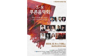 대전시와 (사)3‧8민주의거기념사업회는 3‧8민주의거 64주년을 기념하여 6일 저녁 7시 충남대학교 음악관 콘서트홀에서 3‧8푸른음악회를 개최한다. 이번 음악회는 3‧8민주의거의 정신과 가치를 음악을 통해 알리고, 대중과 함께 그 의미를 기념하기 위해 마련된 특별한 무대이다.이종희 충남대학교 예술대학 음악학과 명예교수의 작곡과 지휘 아래, 실력 있는 성악가들의 노래와 클라리넷, 트럼펫 연주, 느루 콘서트 콰이어의 합창이 어우러져 감동적인 공연을 선사할 예정이다.정진용 3·8민주의거기념관장은 “3‧8민주의거는 이제 대전의 시민정신을 넘어 우리 사회의 문화적 자산으로 자리매김하고 있다”라면서 “이번 음악회를 통해 3‧