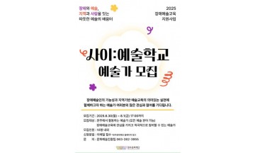 (재)완주문화재단은 2025년 장애예술교육 지원사업의 일환으로 '사이:예술학교' 예술가를 공개 모집한다고 16일 밝혔다. 이번 사업은 장애와 예술, 지역과 사람을 예술로 연결하는 새로운 교육 플랫폼으로, 예술가가 교육의 주체로 참여하여 장애예술인과의 소통을 기반으로 한 예술교육을 실천하는 데에 초점을 두고 있다.모집 대상은 완주에서 활동 중이거나 활동 가능한 모든 예술 분야의 예술인으로, 장애예술교육에 관심을 가지고 적극적으로 참여할 수 있는 사람이라면 누구나 지원할 수 있다. 모집인원은 약 10명 내외이며, 선정된 예술가는 2025년 7월부터 12월까지 약 6개월간 완주군 전역에서 예술교육 관련 활동을 펼치게 된다.선정된