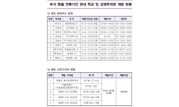 동대문구는 방문객, 역귀성객 등의 주차 편의를 위해 추석 연휴기간인 9월 14일부터 18일까지 5일간 학교 및 공영주차장 14개소를 무료로 임시 개방한다.추석 연휴동안 무료 개방하는 학교 주차장은 군자초등학교를 포함한 초·중·고등학교 9개소이며, 공영주차장은 정릉천 복개공영주차장 등 5개소이다. 개방시간은 장소별로 상이하므로 반드시 확인 후 이용해야 한다.자세한 사항은 구 누리집(구정소식) 또는 행정안전부에서 운영하는 공유누리 사이트를 통해 확인할 수 있다.이필형 동대문구청장은 ”주차장 무료 개방으로 주차시설이 부족한 주택가를 찾는 방문객, 역귀성객들의 편의에 도움이 되길 바란다”며 “가족, 이웃과 함께 따뜻한